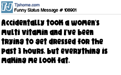 - # 188650 .I accidentally took one of my wife's One-A-Day Vitamins for Women this morning. I've been trying to get dressed for three hours but everything makes me look fat.