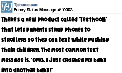 X There's a new product called "Texthook" that lets parents strap phones to strollers so they can text while pushing their children. The most common text message is, "OMG, I just crashed my baby into another baby!"
