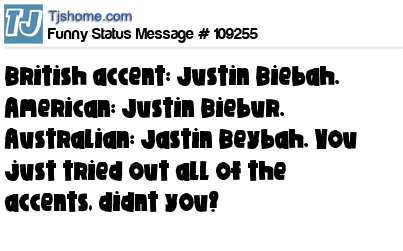 X is British accent: Justin Biebah. American: Justin Biebur. Australian: Jastin Beybah. You just tried out all of the accents, didnt you?