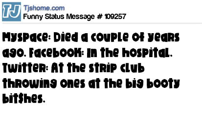 - # 133429 Myspace: Died a couple of years ago. Facebook: In the hospital. Twitter: At the strip club throwing ones at the big booty hoes.