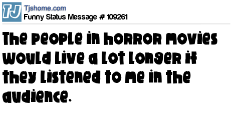 - # 77523 Why do people yell "Hello?" in horror movies. What do you think the killer is going to say? "I'm making a sandwich in the kitchen. Want one?"