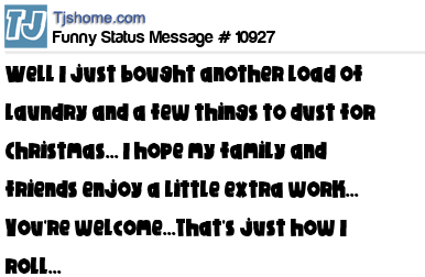 X is Well I just bought another load of laundry and a few things to dust for Christmas... I hope my family and friends enjoy a little extra work... You're welcome...That's just how I roll...
