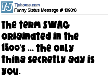 - # 109311 "SWAG" LOL....I love to know where words originate from and in the 1960's a group of men came up with the term "SWAG"....it's meaning Secretly We Are G@y!! True story!! So go get your SWAG on and please post on FB everytime you do so I can laugh at you!!
