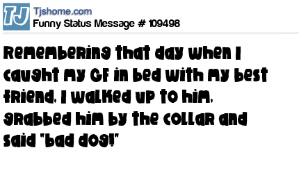 - # 30901 Just caught my girlfreind in bed with my best friend. I threw her out, then grabbed him and shouted, "Bad Dog! Bad Dog!"