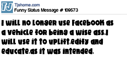 X I will no longer use Facebook as a vehicle for being a wise ass.I will use it to uplift,edify and educate,as it was intended.