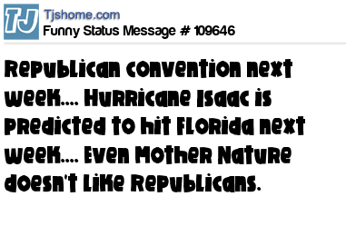 X Republican convention next week.... Hurricane Isaac is predicted to hit Florida next week.... Even Mother Nature doesn't like Republicans.