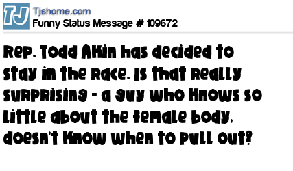 X Rep. Todd Akin has decided to stay in the race. Is that really surprising - a guy who knows so little about the female body, doesn't know when to pull out?