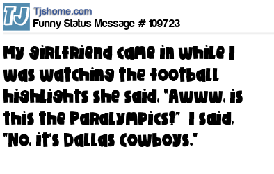 X is My girlfriend came in while I was watching the football highlights she said, "Awww, is this the Paralympics?" I said, "No, it's Dallas Cowboys."