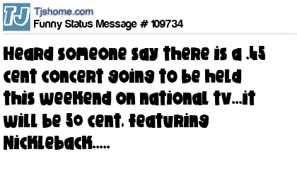 X is heard someone say there is a .45 cent concert going to be held this weekend on national tv...it will be 50 cent, featuring Nickleback.....