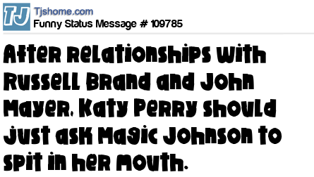 X says After relationships with Russell Brand and John Mayer, Katy Perry should just ask Magic Johnson to spit in her mouth.