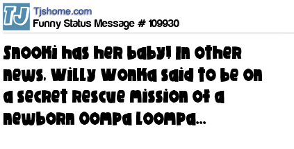 X Snooki has her baby! In other news, Willy Wonka said to be on a secret rescue mission of a newborn Oompa loompa...
