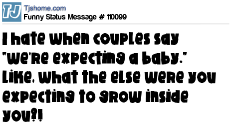 - # 110200 I hate when couples say "we're expecting a baby" ... like you're not expecting an alien to rip out of your tummy? Oh okay, thought it was either one or the other.