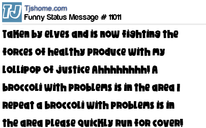 X was taken by elves and is now fighting the forces of healthy produce with my lollipop of justice Ahhhhhhhh! A broccoli with problems is in the area I repeat a broccoli with problems is in the area please quickly run for cover!