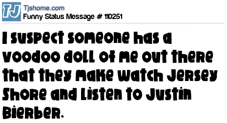 X says I suspect someone has a voodoo doll of me out there that they make watch Jersey Shore and listen to Justin Bierber.