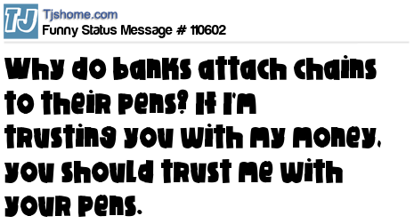 - # 138810 I dont understand banks. Why do they attach chains to their pens? If I'm trusting you with my money, you should at least trust me with your damn pens!"