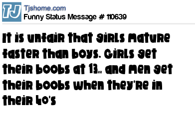 X It is unfair that girls mature faster than boys. Girls get their boobs at 13,, and men get their boobs when they're in their 40's