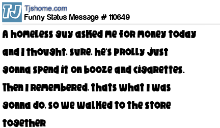 - # 174985 A homeless guy asked me for money today and I thought, sure, he’s probably just gonna spend it on booze and cigarettes. Then I remembered, that’s what I was gonna do, so we walked to the store together.