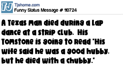 X A Texas man died during a lap dance at a strip club. His Tomstone is going to read "His wife said he was a good hubby, but he died with a chubby."