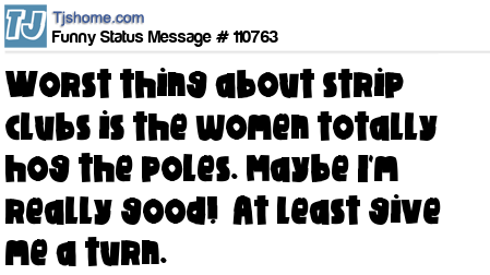 X says Worst thing about strip clubs is the women totally hog the poles. Maybe I'm really good! At least give me a turn.
