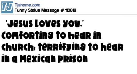 - # 97659 "Jesus loves you." It's so nice to hear that said to oneself in church!! ... "Jesus loves you." A horrific thing to hear in a Mexican prison!!