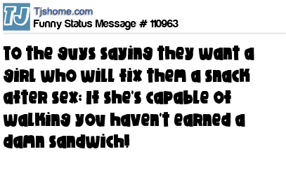 - # 109482 Guys are always saying they get their woman to make them a sandwich right after sex. If she can walk straight after having sex, you're doing it wrong! Go make your own damn sandwich!