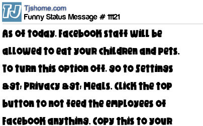 - # 10967 As of today, Facebook staff will be allowed to eat your kids and pets. To turn this option off, go to Settings, then Privacy, then Meals. Click the top button to not feed the employees of Facebook. Copy this to your status to warn your friends!