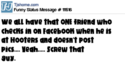 X We all have that ONE friend who checks in on Facebook when he is at Hooters and doesn't post pics.... Yeah..... Screw that guy.