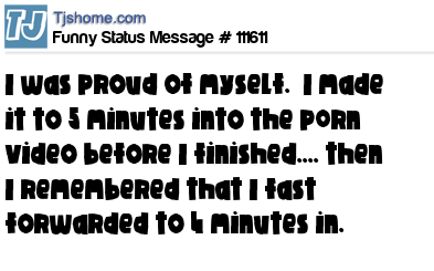 X I was proud of myself. I made it to 5 minutes into the p0rn video before I finished.... then I remembered that I fast forwarded to 4 minutes in.