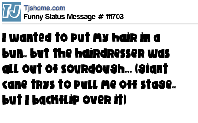 X I wanted to put my hair in a bun,, but the hairdresser was all out of sourdough... (giant cane trys to pull me off stage,, but I backflip over it)