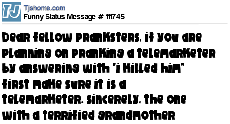 X dear fellow pranksters, if you are planning on pranking a telemarketer by answering with "i killed him" first make sure it is a telemarketer. sincerely, the one with a terrified grandmother