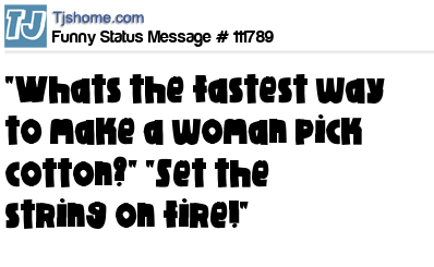 X says "Whats the fastest way to make a woman pick cotton?" "Set the string on fire!"