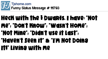 X Heck with the 7 Dwarfs, I have: "Not me"; "Don't know"; "Wasn't Home"; "Not Mine"; "Didn't use it last"; "Haven't Seen it" & "I'm Not Doing It!" living with me