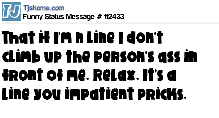 X says that if I'm n line I don't climb up the person's ass in front of me. Relax. It's a line you impatient pricks.