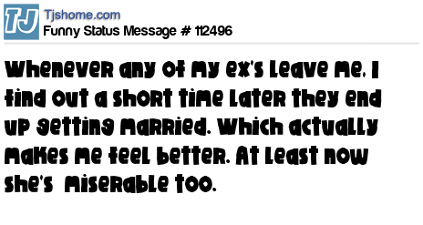 X Whenever any of my ex's leave me, I find out a short time later they end up getting married. Which actually makes me feel better. At least now she's miserable too.