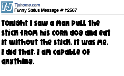 X is Tonight I saw a man pull the stick from his corn dog and eat it without the stick. It was me. I did that. I am capable of anything.