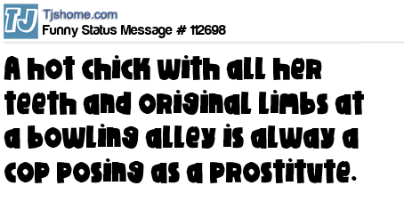 X says A hot chick with all her teeth and original limbs at a bowling alley is alway a cop posing as a prostitute.