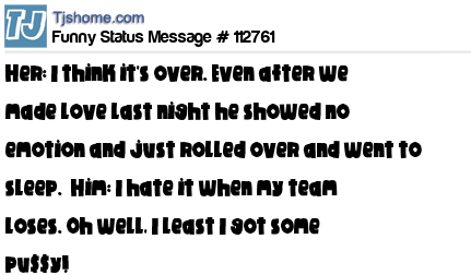 X says Her: I think it's over. Even after we made love last night he showed no emotion and just rolled over and went to sleep. Him: I hate it when my team loses. Oh well, I least I got some pu$$y!