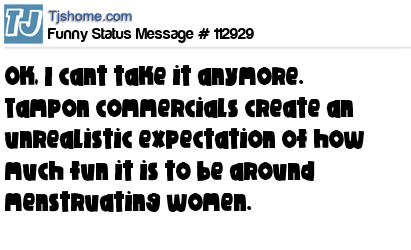 - # 149128 Tampon commercials create an unrealistic expectation of how much fun it is to be around menstruating women.