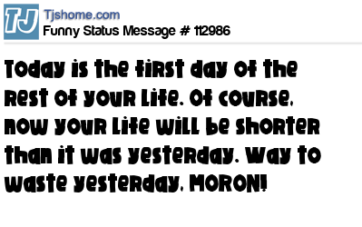X says Today is the first day of the rest of your life. Of course, now your life will be shorter than it was yesterday. Way to waste yesterday, MORON!