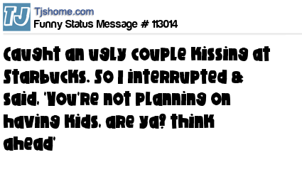 X says Caught an ugly couple kissing at Starbucks. So I interrupted & said, 'You're not planning on having kids, are ya? think ahead'