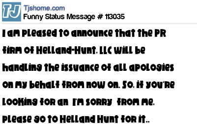 X I am pleased to announce that the PR firm of Helland-Hunt, LLC will be handling the issuance of all apologies on my behalf from now on. So, if you're looking for an “I'm sorry” from me, please go to Helland Hunt for it..