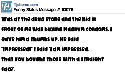 X Was at the drug store and the kid in front of me was buying Magnum condoms. I gave him a thumbs up. He said "Impressed?" I said "I am impressed, that you bought those with a straight face".
