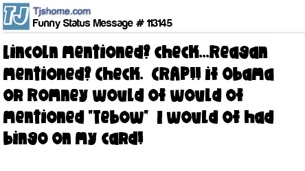 X is Lincoln mentioned? check...Reagan mentioned? Check. CRAP!! if Obama or Romney would of would of mentioned "Tebow" I would of had bingo on my card!