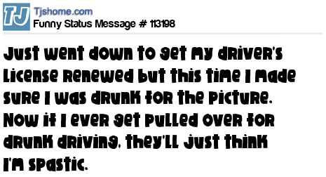- # 149321 Just went down to get my driver’s license renewed but this time I made sure I was drunk for the picture. Now if I ever get pulled over for drunk driving, they’ll just think I’m spastic.