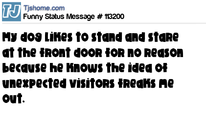 X says My dog likes to stand and stare at the front door for no reason because he knows the idea of unexpected visitors freaks me out.