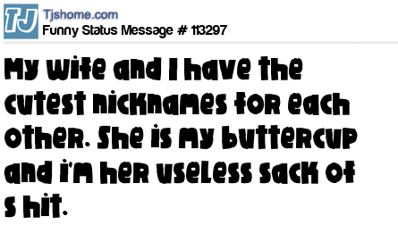 X says My wife and I have the cutest nicknames for each other. She is my buttercup and i'm her useless sack of s hit.
