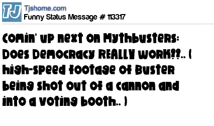 X Comin' up next on Mythbusters: Does Democracy REALLY work??.. ( high-speed footage of Buster being shot out of a cannon and into a voting booth.. )