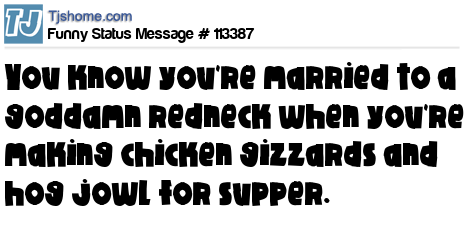 X says You know you're married to a goddamn redneck when you're making chicken gizzards and hog jowl for supper.