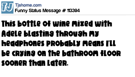 X says This bottle of wine mixed with Adele blasting through my headphones probably means I'll be crying on the bathroom floor sooner than later.