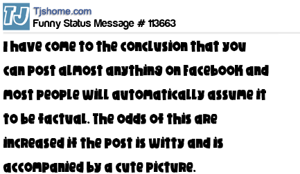 X I have come to the conclusion that you can post almost anything on Facebook and most people will automatically assume it to be factual. The odds of this are increased if the post is witty and is accompanied by a cute picture.